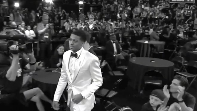 时间拉回到2019年选秀大会,烤鸡在首轮第29顺位被马刺选中。