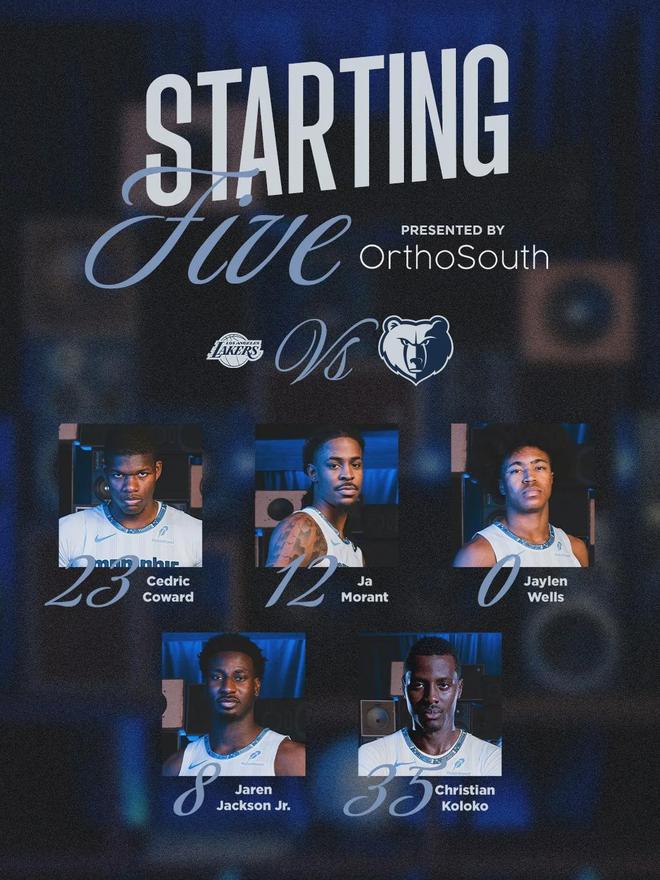 灰熊本场首发:莫兰特、科沃德、韦尔斯、小贾伦-杰克逊、科洛克。湖人首发:东契奇、斯玛特、詹姆斯、拉拉维亚、艾顿。过去四场比赛,艾顿有两场只抢到2个篮板球。东契奇过去四场的三分命中率仅30.8%,场均近6次失误。