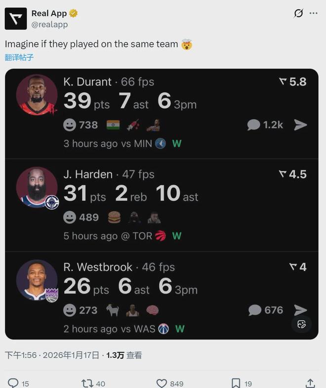 北京时间1月17日,NBA常规赛:火箭110-105击退森林狼;国王128-115战胜奇才;快船加时121-117险胜猛龙。媒体晒出杜兰特、威少和哈登今天的数据并写道:“想象一下,如果他们还在一起打球。”评论区球迷纷纷表示泪目了。