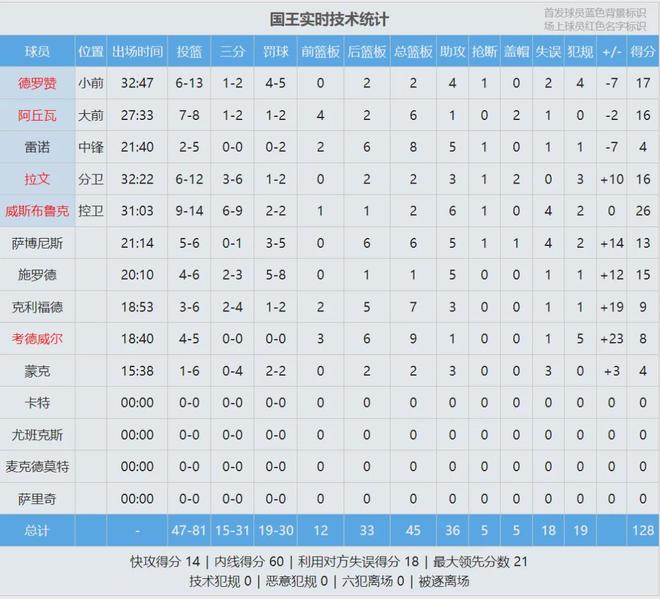 来看看国王和奇才的比赛数据: