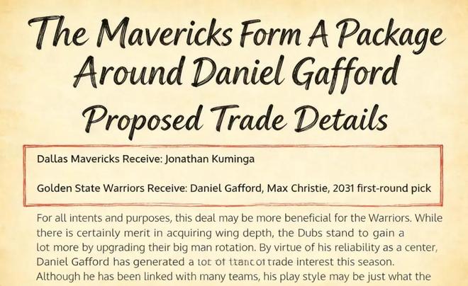 美媒《Fadeaway World》撰文建议,勇士应该将库明加送到达拉斯,换回加福德、克里斯蒂以及2031年的首轮签。