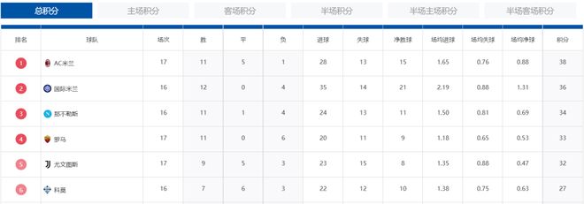 意甲最新积分战报 莱奥破门 AC米兰16轮不败 超国米2分登顶