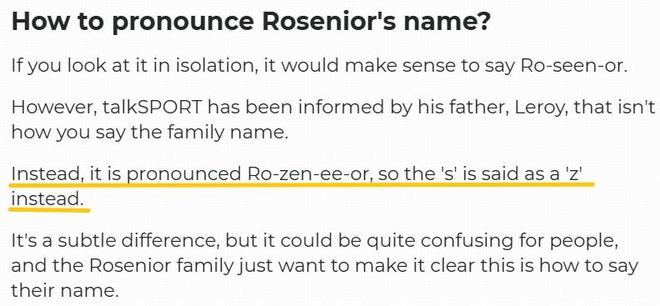在切尔西官宣后,英媒tallkSPORT采访了罗塞尼尔的父亲老罗塞尼尔,而老罗塞尼尔称,这个名字的发音并非是“Ro-seen-or”,而是“Ro-zen-ee-or”,也就是说,“S”要发“Z”的音,翻译过来即为罗曾尼尔。
