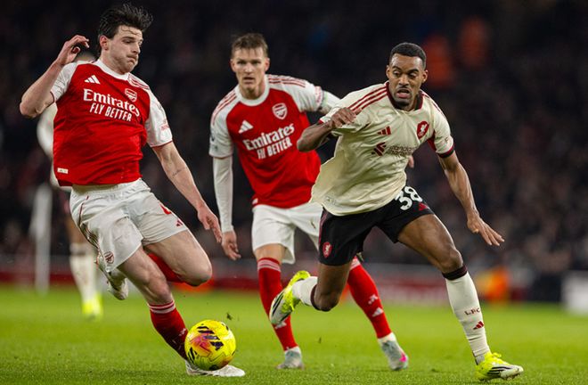 阿森纳首发:1-拉亚、12-廷伯、2-萨利巴、6-加布里埃尔、5-因卡皮耶、8-厄德高、36-苏维门迪、41-赖斯、7-萨卡、14-约克雷斯、19-特罗萨德