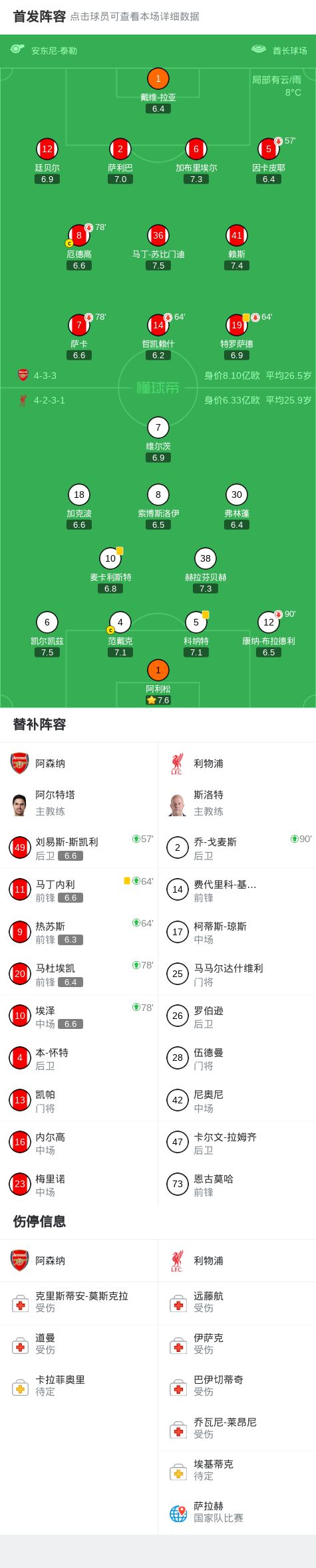 阿森纳vs利物浦:哲凯赖什、厄德高首发,维尔茨、加克波出战