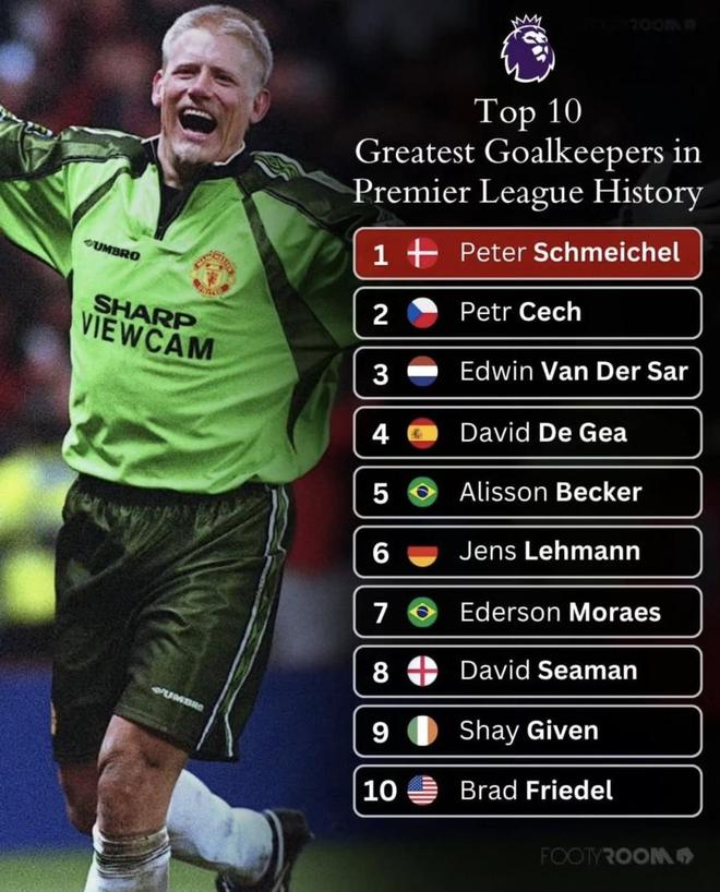 这份英超门将Top10的大方向不离谱:舒梅切尔、切赫、范德萨坐在前排,基本符合多数人的直觉。舒梅切尔排第1,更多是“时代统治力+关键战硬度”的加成;切赫的稳定性、零封纪录和长周期输出也很难被绕开;范德萨英超年头没另外两位那么长,但在曼联那段的控制力和大场面气质,放进前三也说得通。