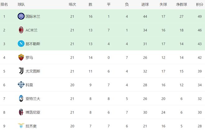 在积分榜上,国际米兰依然高居榜首,总积分是49分。而AC米兰赢球之后,总积分达到46分,排名第2,只比国际米兰少3分。卫冕冠军那不勒斯43分排名第3,依然有冲击冠军的希望。罗马3连胜之后,杀入了欧冠区,总积分42分排名第4。尤文图斯则掉到了第5名的位置,总积分是39分。科莫少赛一场,总积分是34分,排名第6。亚特兰大32分排名第7。博洛尼亚30分排名第8。拉齐奥只拿到28分,排名第9。